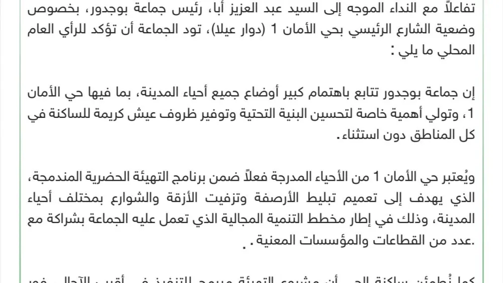 بلاغ تفاعلي بخصوص النداء الموجه حول وضعية الشارع الرئيسي بحي الأمان 1 (دوار عيلا) ...